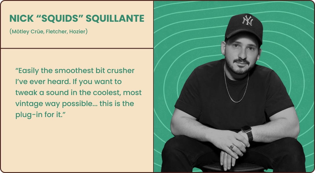 - Rate — Reduce sample rate for gritty aliasing from subtle to extreme.